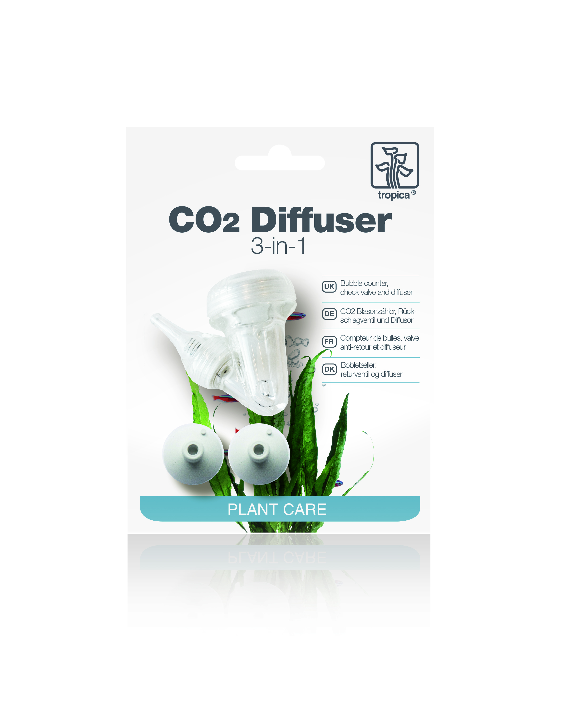 Der CO2-Zerstäuber von Tropica vereint Blasenzähler, Rückschlagventil und Diffusor in einer einzigen Einheit. Der Blasenzähler ermöglicht eine einfache und genaue Dosierung des CO2, da sich die großen Blasen in der Kammer bei der Einstellung leicht zählen lassen. Ein Rückschlagventil gewährleistet, dass Wasser aus dem Aquarium nicht in den Schlauch zurückgesaugt wird, was passieren kann, wenn die Flasche leer läuft oder mit einem Magnetventil gearbeitet wird, um die CO2-Zufuhr nachts abzuschalten.