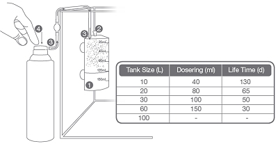 Die Tabelle gibt die empfohlene Dosierung (in ml) für die verschiedenen Aquariumgrößen an. Die Kammer einmal wöchentlich entlüften, indem der Ventilstopfen entfernt wird. Eine CO2-Dose enthält ca. 5000 ml und hält bei einem 60-l-Aquarium einen Monat lang (siehe Tabelle).